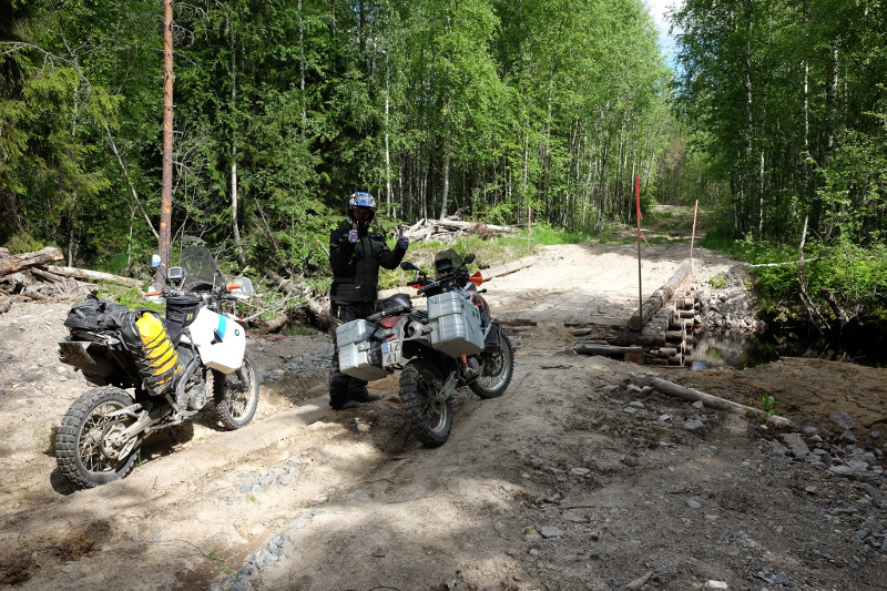 Tie oli enduromiehen taivas eikä siitä nautiskellessa kiinnitetty erityistä huomioita navigointiin, vedettiin vaan fiilispohjalta ja nautittiin täysillä huonosta, eli hienosta, tiestä. Jossain vaiheessa tie sitten loppui. Tai olisihan se jatkunut joen toisella puolella, sillan vain oli joku polttanut välistä. Tapahtumasta oli ilmeisesti kulunut jo hyvän aikaa, sillä joen törmälle keskelle tietä oli kasvanut miehen mittainen mänty. Takaisin ei tehnyt mieli. Päätettiin pitää lounastauko. Täysin vatsoin maailma näytti taas paremmalta.