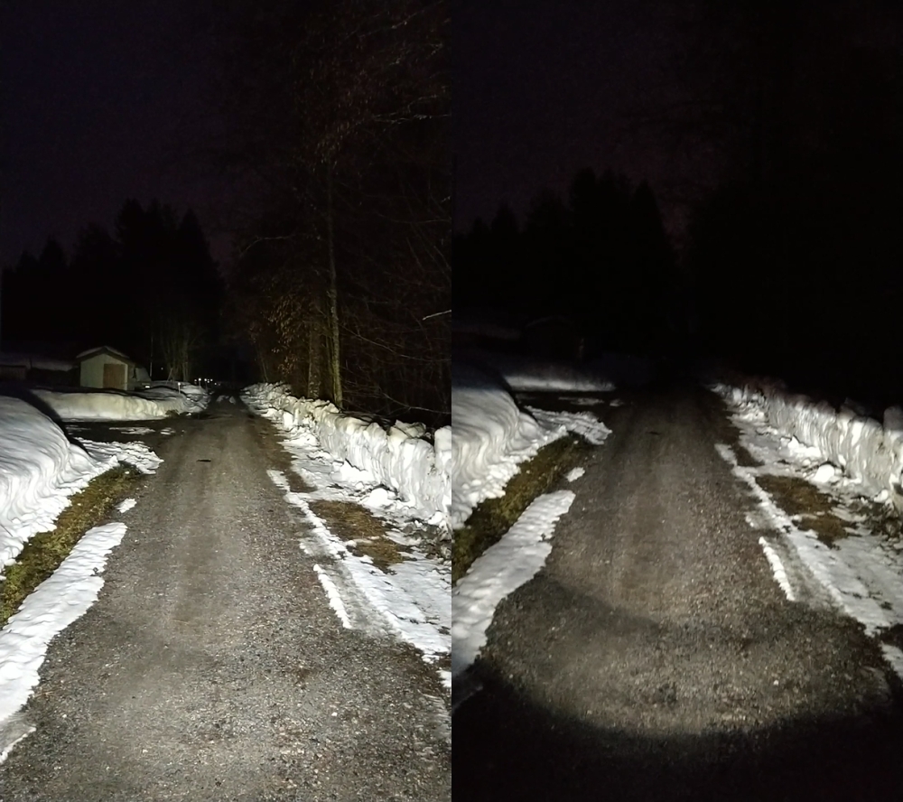 ja alkuperäinen valo. Tässä on jo lumi maassa, eli ei voi verrata suoraan, mutta valo tulee pääosin kypärävalosta, eikä pyörän valojen keilaa juuri huomaa.