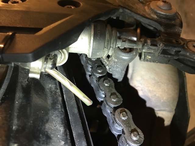 Öljy valuu eturattaan molemmille puolille, nyt öljynä ollut jonkin synteettisen mottoriöljypurkin pohjilta liruteltu öljy. Vaihteistoöljyä seuraavaksi jahka täyttöä tarvitsee. Primerikupla on Dakarin alkuperäisen virranulosottopistokkeen paikalla. Aika jäykkä on pohjaan painaa, mutta hyvin on ketjut rasvassa pysyneet, eikä ole vanteelle roiskunut.