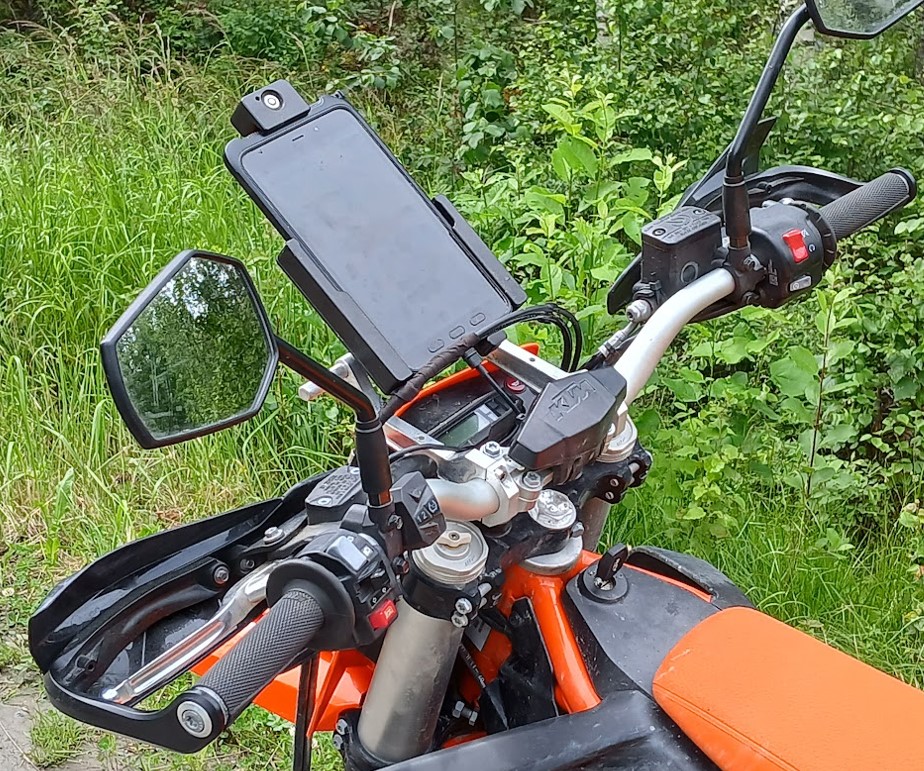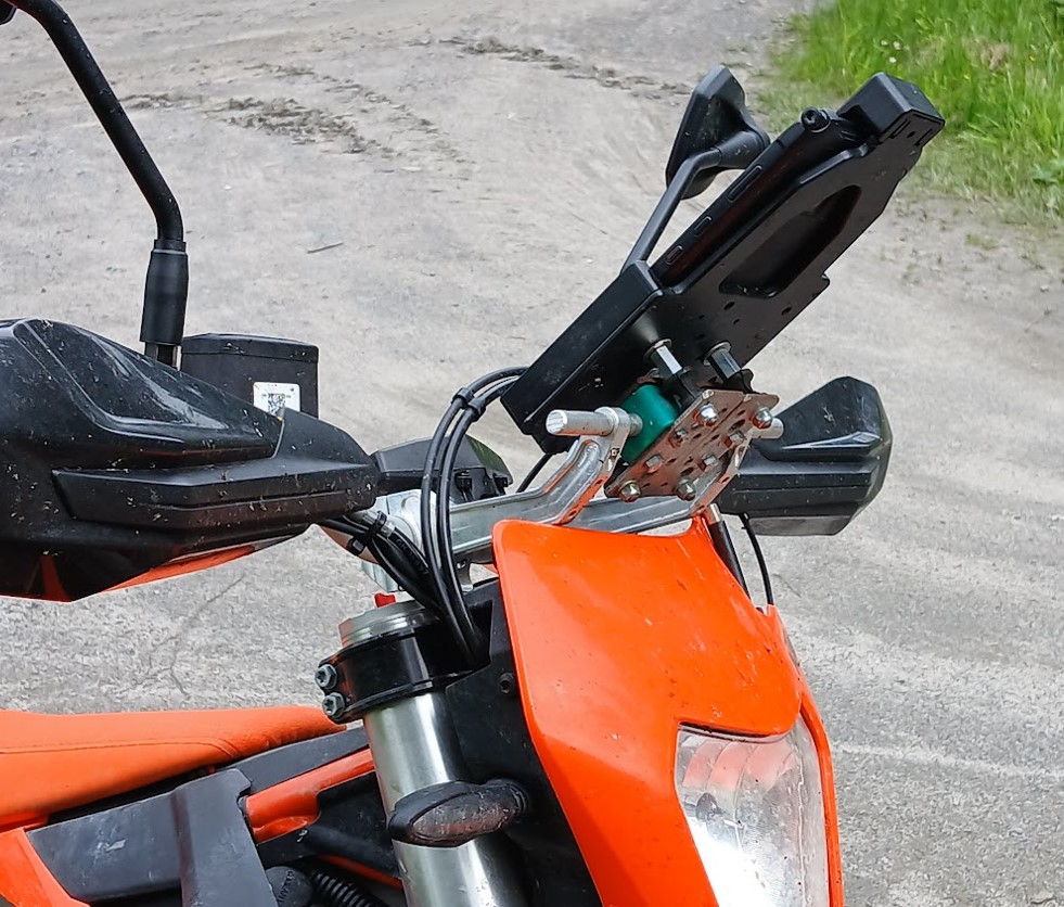 Olen tähän ketjuun postannut alkuperäisen version Active Tab 3:n kiinnityksestä 690:iin ja "690:n fairing kit" -ketjuun seuraavan kehitysversion. Kun vaihdoin uuteen 690:iin, tutkailin mahdollisuutta laittaa tabletti pystyyn samaan telineeseen ja aika nopeasti kävi selväksi, että maskia ja pleksiä ei ole järkevää viedä niin paljon eteenpäin, mitä tabletin pystyasennus vaatii. Niinpä jätin koko pleksin pois ja maski sai jäädä omalle paikalleen. Kiinnityksen kumivaimennus tuntuu edelleen toimivalta kuoppaisemmallakin tiellä, vaikka pystyasennuksessa tabletilla on enemmän vipuvartta kumeihin.