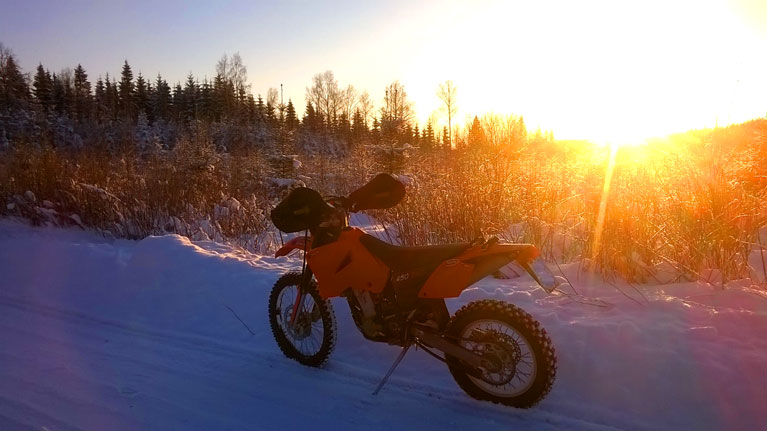 Sellaisen huomion tein, että tuollaisella kaasarikoneella kyllä kannattaa kytkinkahva jättää paikalleen. Tai ainakin jos pyörällä on taipumusta ottaa itseensä umpihankiajosta.