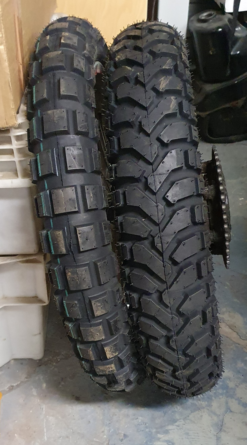 Viimeiset kuusi vuotta olen ajanut Dunlop 100/90-19 57T TT TRAILMAX estupyörässä, mutta voisi edessä olla soralla hieman enemmänkin pitoa. Jostain löysin, että tuo trailmax olisi 80/20 (80 road/20 off-road) rengas?