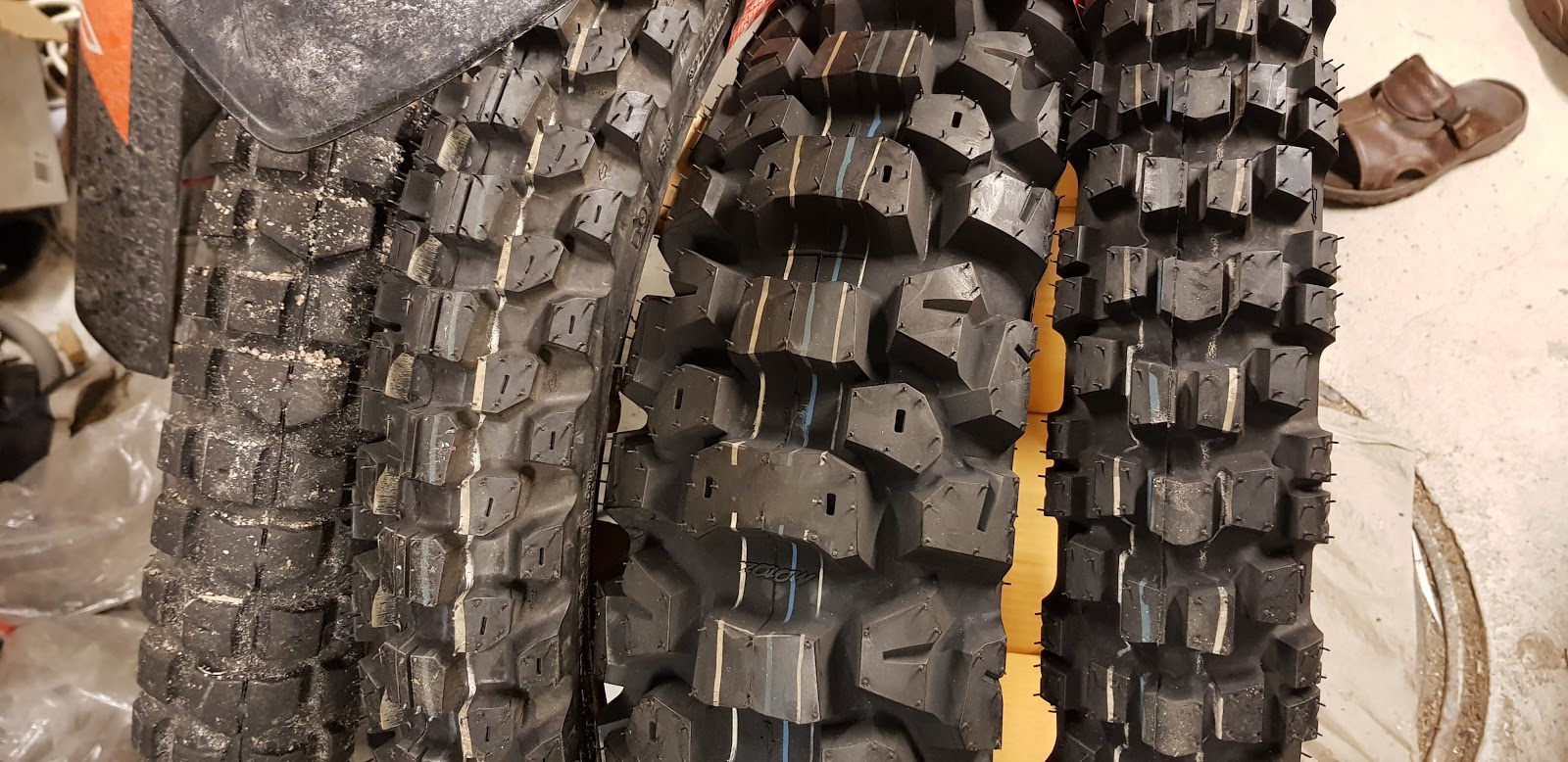 Vasemmalla nyt alla olevat Pirelli (pettymys) ja sitten vasemmalta Motoz:et 21 Tractionator Desert, 18 Tractionator Desert ja 21 Tractionator RallZ